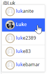 If you wish to mention someone, and have them be alerted of this, you can use the @ symbol in conjunction with their username. Mentions have an autocomplete feature (pictured below) so all you need to do is start typing and select the user in question from the drop-down menu. Mentions trigger alerts, so they are useful if you want to get someones’ attention.