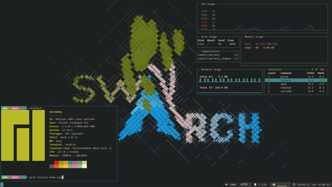 Arch Linux on the Pinebook Pro via Screenshot via @AndreVallestero https://github.com/AndreVallestero