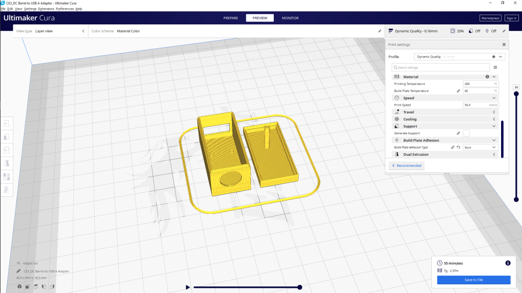 In my case, I already have the 5V 5A DC power supply on hand (a spare for LED lights), and I bought the USB to barrel plug previously for my Pinebook Pro to power it from a wall wart. But I don’t have one of those fancy adapters on hand to connect them together. Plus, I don’t really want to wait for one to arrive in the mail. So, I’ll instead fire up my 3D printer and have some extra fun!