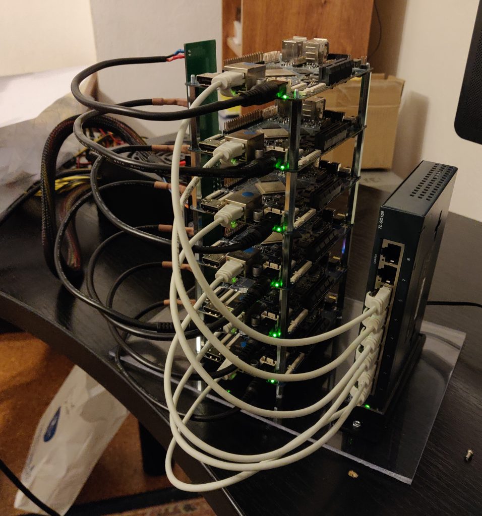 Let’s start from beginning. When we built the current hosting cluster a year ago, it was made in quite a hurry (some of the services needed to be migrated to the cluster on a moment’s notice). Also, it was the first time I (gamiee) and Matthew (fire219) were tasked with building a cluster. Because of this, some of the cluster’s features are missing and various things don’t work quite as well as we have hoped. For example, the cluster has power management boards (PCB on right side of every row), which are used primary for power distribution to the SBCs, but also it also has a I2C GPIO Expander for rebooting and turning off the SBCs. The I2C Expansion isn’t in use yet, because the primary node wasn’t able to detect it, so this is something that needs to be checked out when the cluster is turned off. And this is exactly the main reason why we are building a temporary cluster. We need to do some changes which require us to have the whole cluster turned off and on a workbench (not in housing room where isn’t much space), and this means that it will be inaccessible for several days. Obviously a long downtime wouldn’t be good when 100% of PINE64 community services are running on it. So we are going to build a temporary small cluster, which will have the minimal number of required nodes to have all services running, so we can make all upgrades with precision and at our own pace.