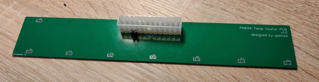 From this connector we will just need +12V, Ground and Power On pin. The Power On pin needs to be connected to ground by the “motherboard” to turn on the power supply. I added a 2-pin jumper header for this, so I can turn it on / off using the jumper. The last thing we need is power output for the nodes. There are several ways of doing this: we can use USB female connectors (with USB to Barrel Jack cable), barrel jack female connector (with barrel jack-to-barrel jack cable) and screw-on terminals or just holes, where you can screw / solder the wires going out from barrel jack cable. I chosen to use just the holes. Doing so I had to be careful about the size and distance between them. Since I picked a very accurate size and distance, it proved a bit problematic to solder cables into it (I will use screw terminals next time). Basically, that’s all! It’s nothing fancy, but it will do the job for the time being while the hosting cluster is in maintenance.