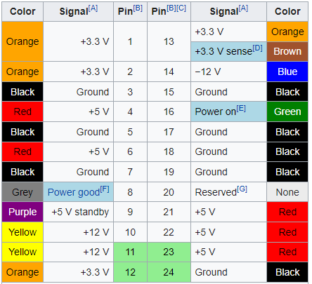 As I mentioned before, we are going to use main ATX Power connector, which is a 20-pin or 24-pin Molex. We will use 24-pin one, since it contains additional +12 V pin. We can find this connector as Molex 39-28-1243. The pinout is here: