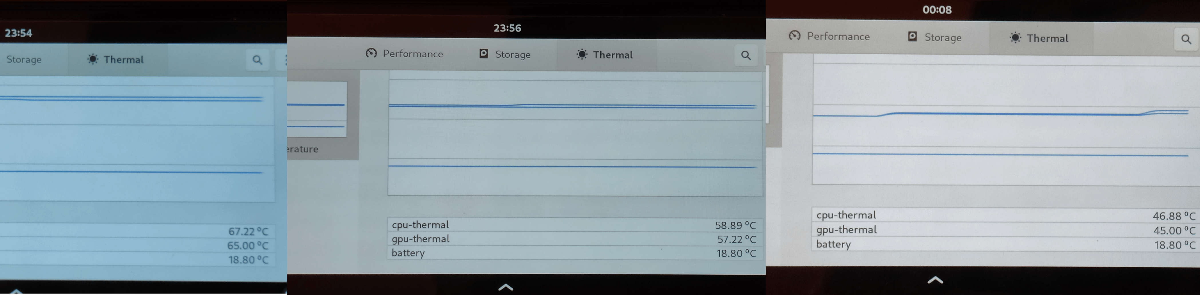 From left to right: Temps under load, after one minute and after ten minutes of cool-down