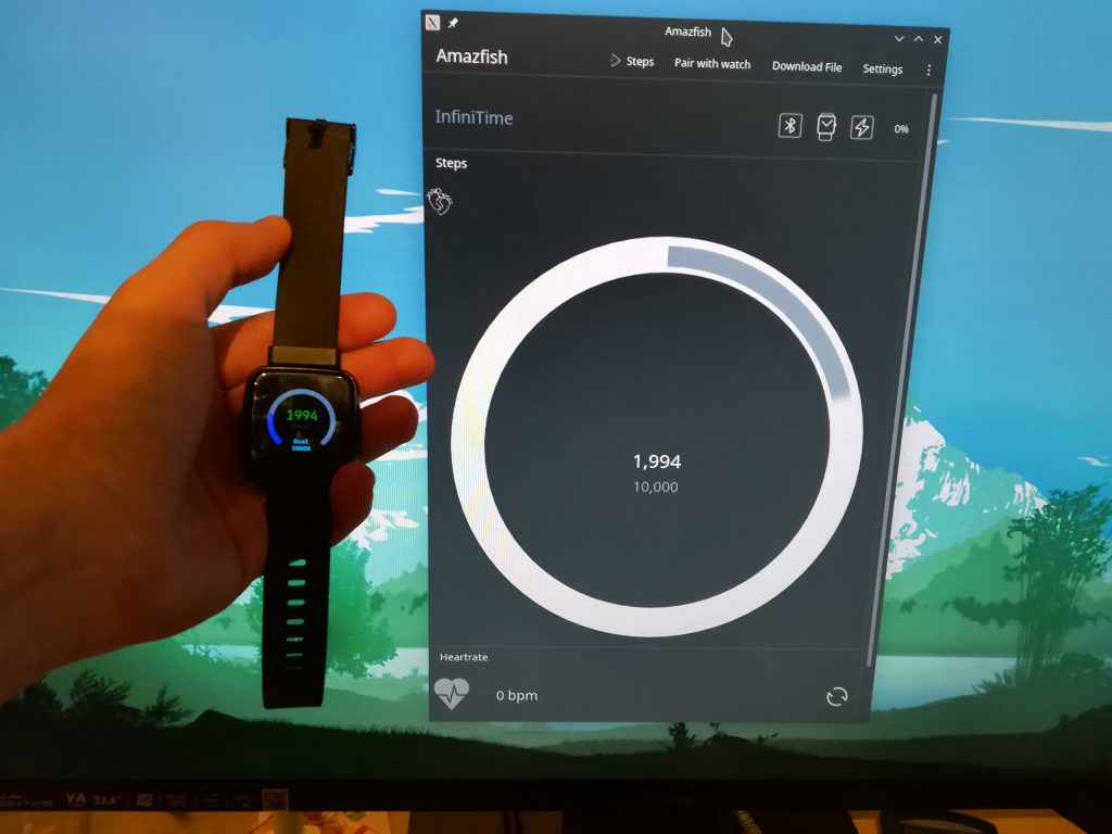Step-count synced from PineTime to Amazefish on Linux PC
