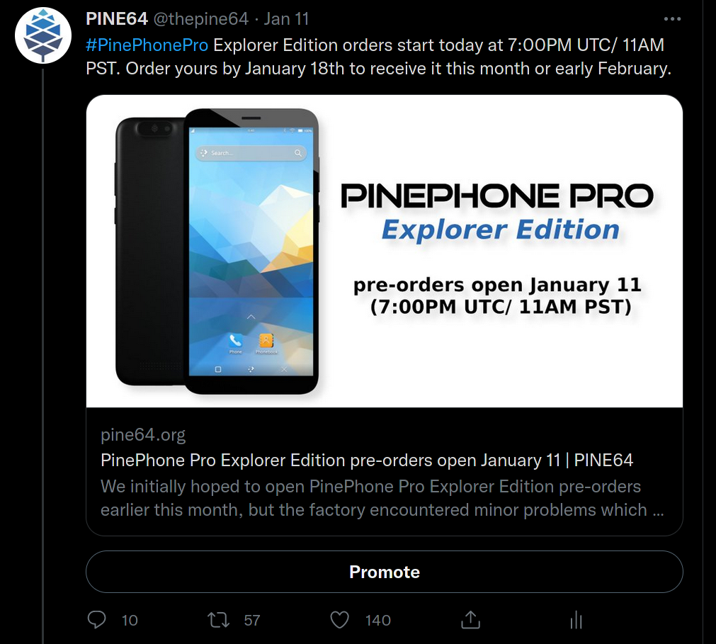 - PinePhone Pro orders placed before January 18th ship late January; orders placed on and after January 18th ship in late February, after Chinese New Year