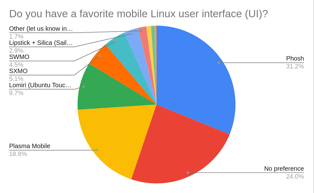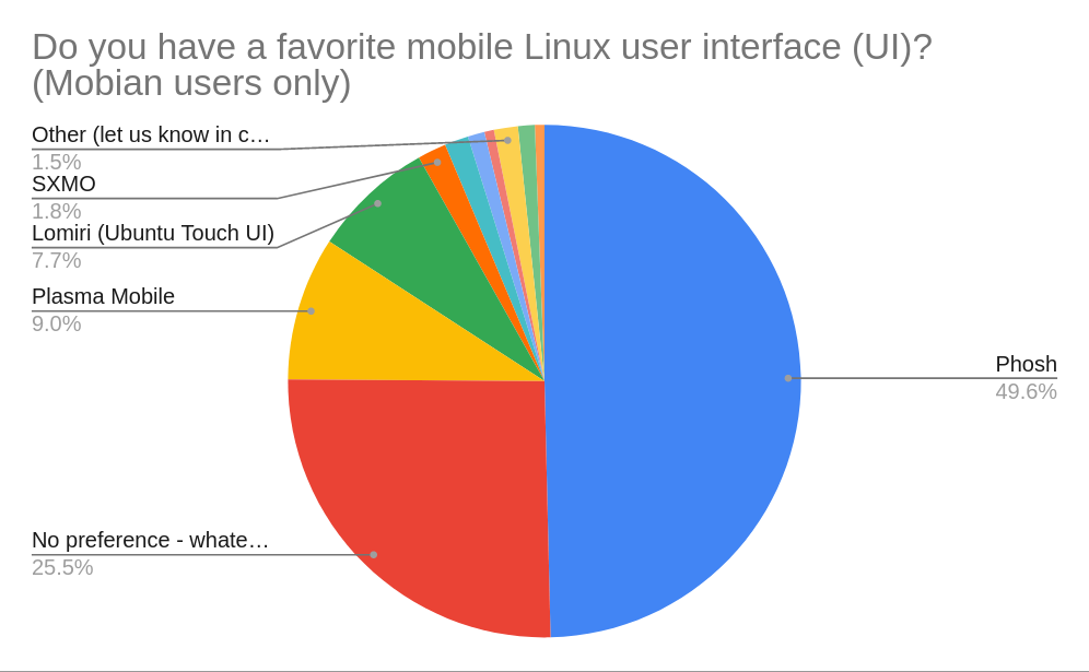 Unsurprisingly Phosh is the UI of choice for Mobian users, half of which selected it as their preferred UI. Interestingly, a fourth reported not having a strong UI preference.