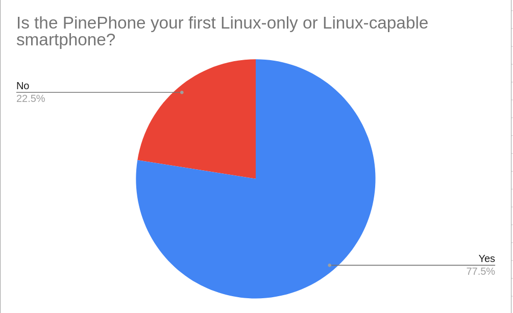 Although the majority of users reported the PinePhone being their first Linux smartphone, I was surprised to learn that just under a fourth of all respondents have previous experience with mobile Linux. This value is much higher than I expected. I suspect that this result is not representative of the entire PinePhone community.