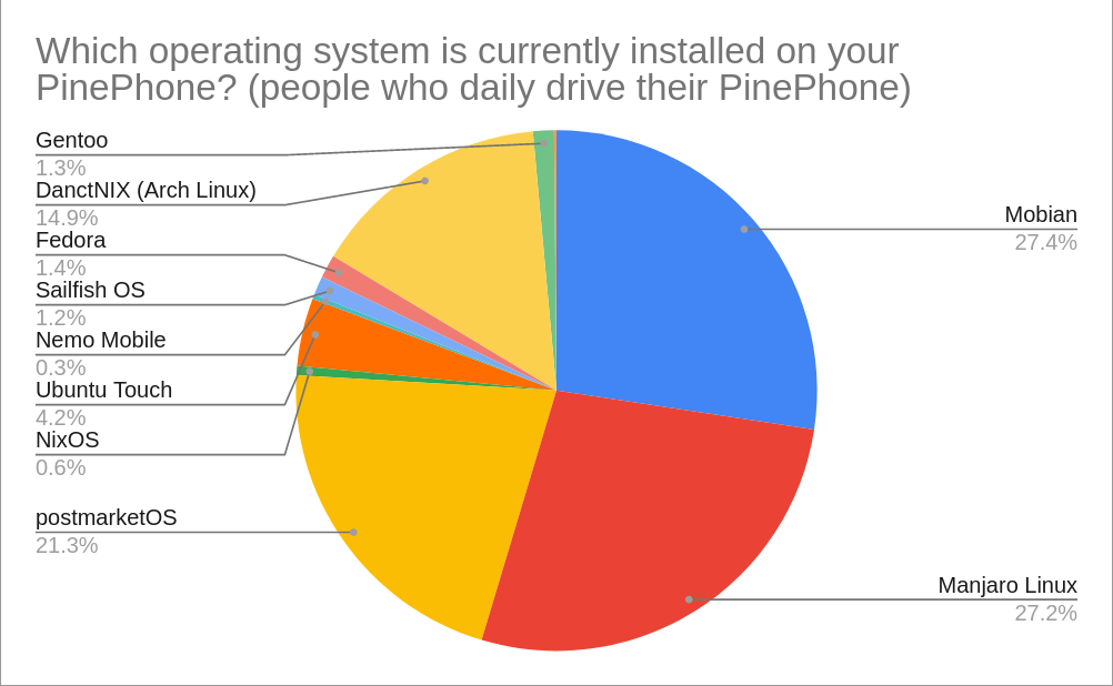 The majority of users who daily drive their PinePhone use either Mobian or Manjaro Linux - both of which account for just under a third of installs each. postmarketOS and DanctNIX (Arch) come in second and third place with a fifth and a seventh of all installations respectively.