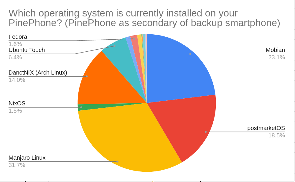 Among those who use their PinePhone as a backup or secondary smartphone, Manjaro Linux is the most popular OS with nearly a third of all installations. Mobian is the second most popular, with a quarter of all installations, followed by postmarketOS and DanctNIX (Arch) with approximately a fifth and a seventh of installations respectively.