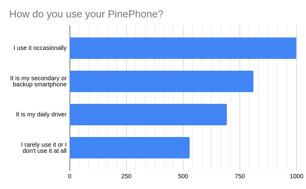 I was excited to find that a fourth of all respondents daily drive their PinePhone. Over a quarter of all respondents also use their PinePhone as a secondary smartphone, while a third report using their PinePhone occasionally.