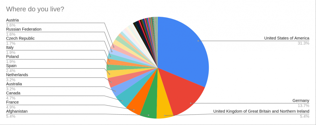 As expected, the number of respondents in Africa, South America, the Middle East, India and South Asia is low, with Japan being the sole exception. We are still experiencing issues shipping to India and some South American countries (Brazil in particular), which likely accounts for the low response numbers from these geographic regions.