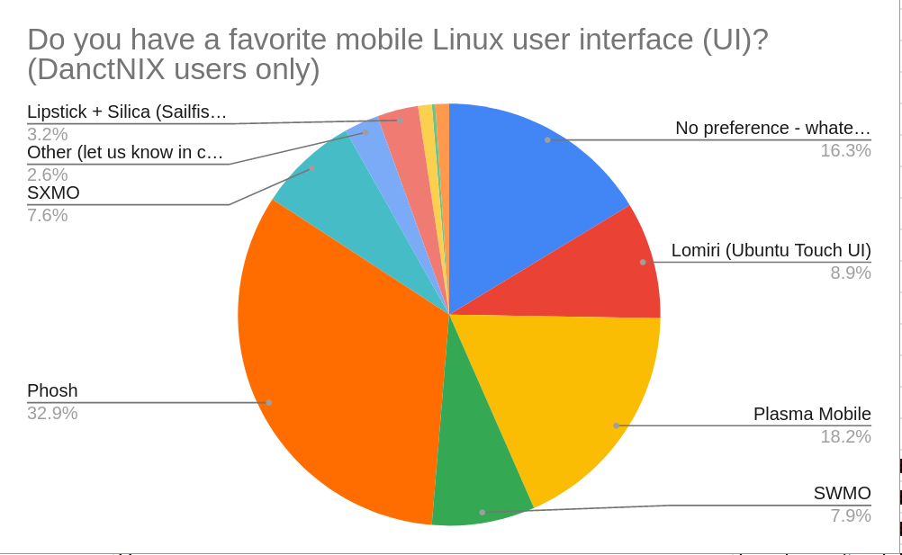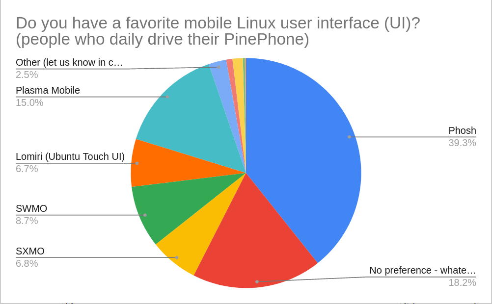 A tenth of all respondents in this subsample chose Lomiri as their favorite UI. This is interesting, since this number is comparatively large when contrasted with Ubuntu Touch’s popularity on the PinePhone. I suspect that this indicates people like the Lomiri UI but find obstacles elsewhere in the Ubuntu Touch OS, leading them to switch to one of the four most popular OSes. In other words, they like the UI the best but don’t actually use the OS that offers it.
