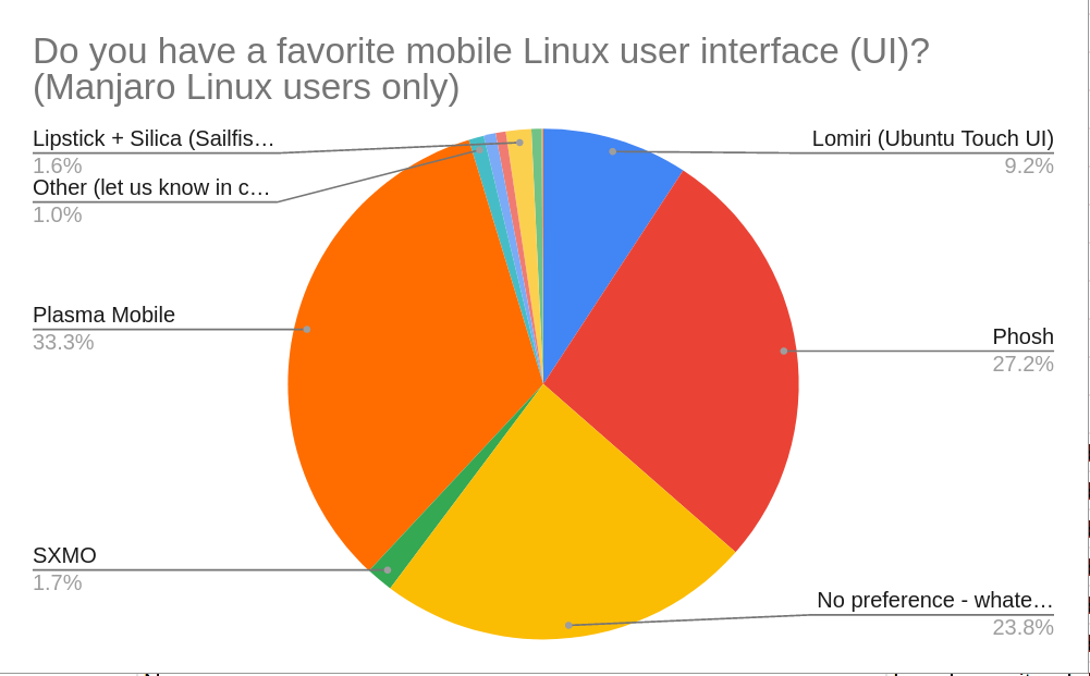 Plasma Mobile is the most popular UI among Manjaro, accounting for a third of all installations. This is quite predictable given that the default OS image installation shipping on the PinePhone offers this exact OS-UI combination. That said, Phosh is nearly as popular with just under a third of all respondents selecting it as their favorite. A quarter of Manjaro users claim that they do not have a strong preference for any UIs, as long as the UI is efficient and bug-free.
