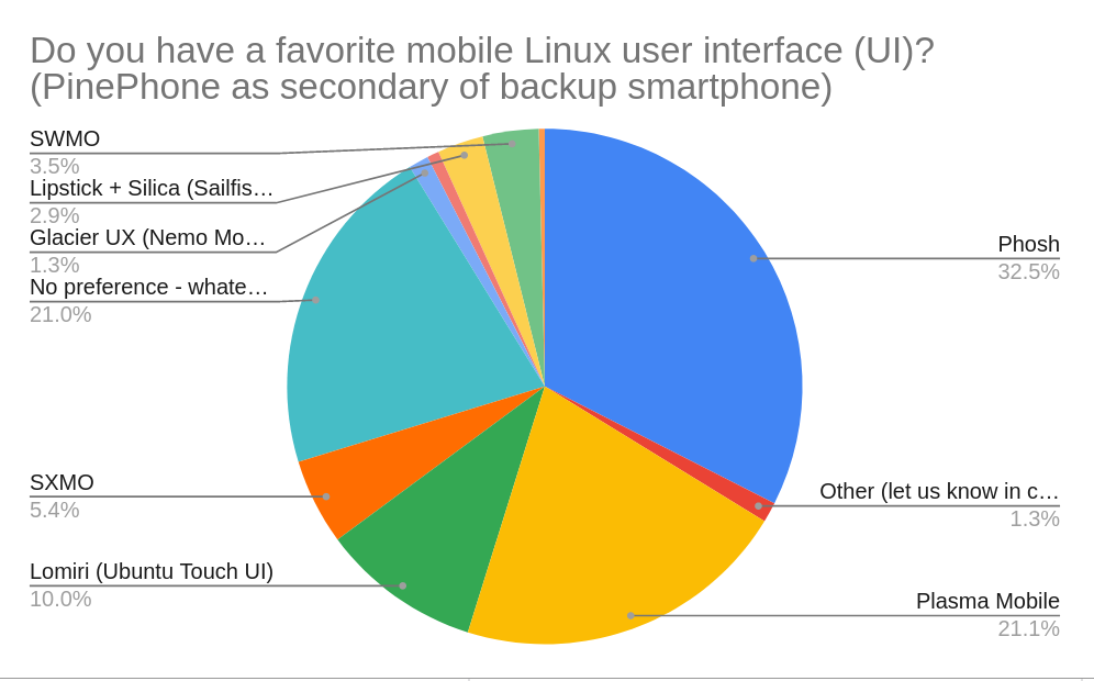 Phosh is the most popular UI for people who use their PinePhone as a secondary smartphone with a third of all installations, while Plasma Mobile comes in second with a fifth of all installations.