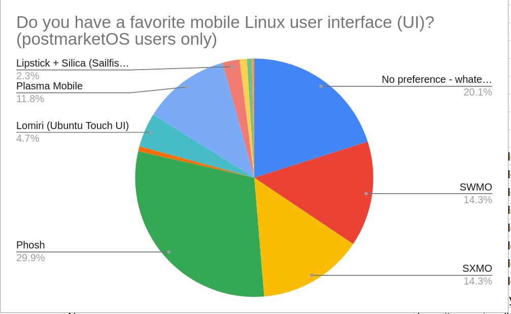 As for user interfaces: about a third of all respondents have a preference for Phosh and a fifth for Plasma Mobile. One in ten respondents reports liking Lomiri best. Somewhat surprisingly one in ten respondents has a preference for either SXMO or SWMO (approx 5% each) - this is more than I’d expect given the novelty and complexity of the UI(s). I suspect that the high number of respondents using SXMO and SWMO reflects on the high degree of Linux literacy in the survey sample.