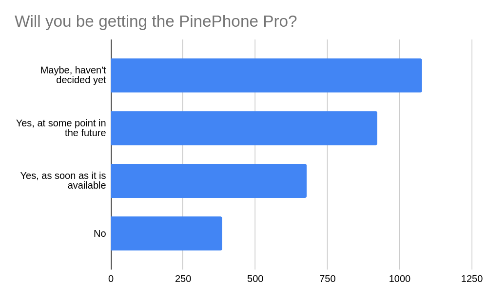 Finally, I am glad to see so many respondents are planning on picking up a PinePhone Pro now or in the future. This is obviously good news for us, our community and the mobile Linux crowd in more general. In a year it may be worth running a similar poll inquiring about the PinePhone Pro to learn whether we met the expectations with our new device.