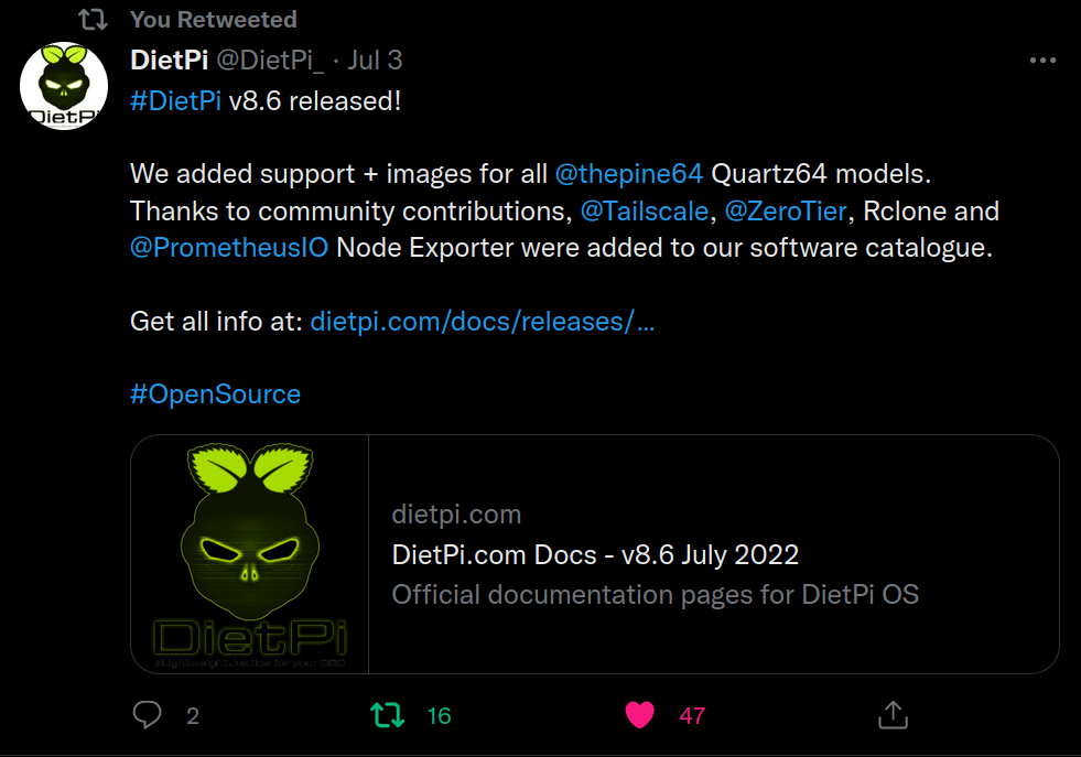 - Quartz64 receives DietPi support; now supported by Armbian, Manjaro, DietPi as well as giving option to run Arch Linux and NetBSD