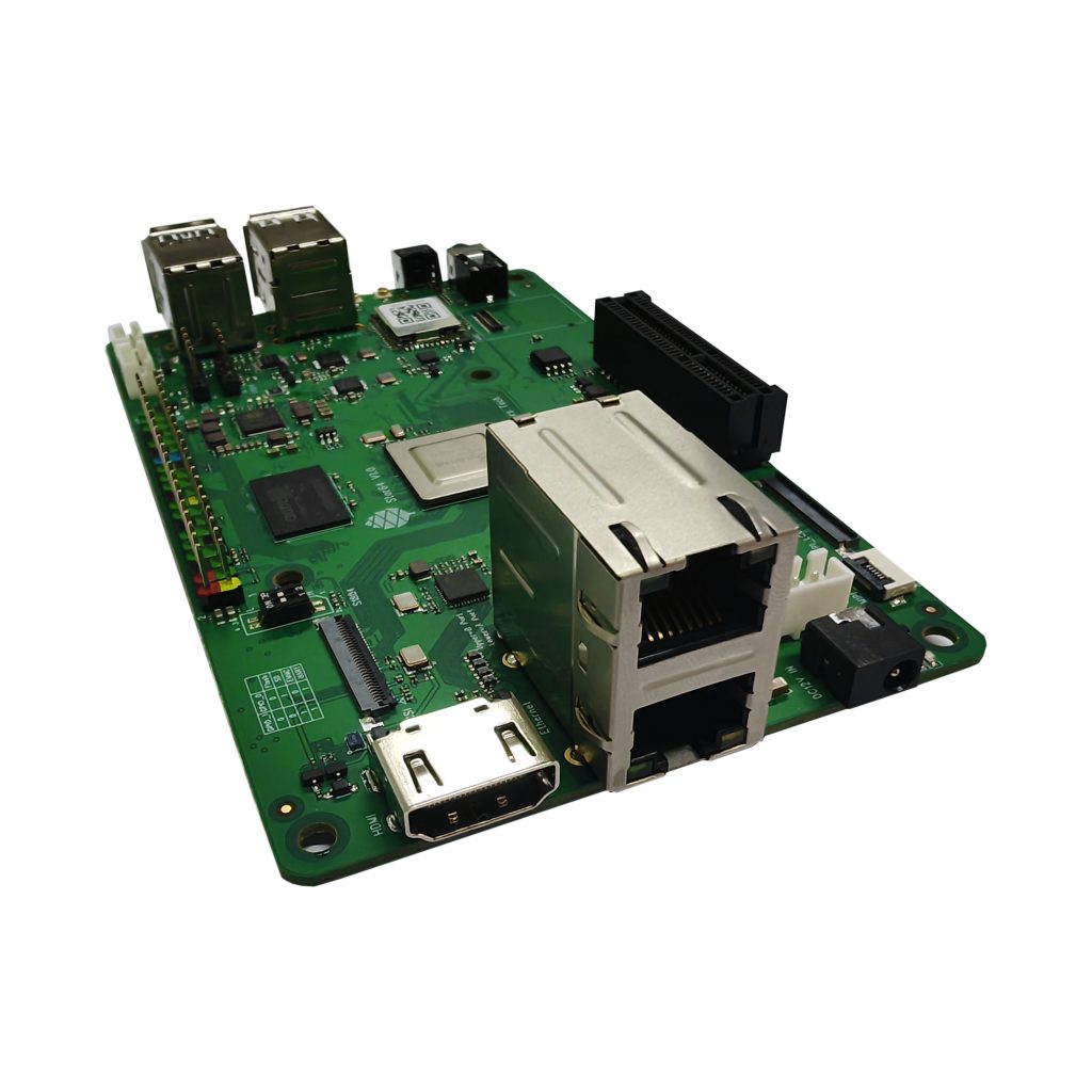 The IO arrangement is very similar to what you’ve come to expect from one of our model-A type boards. Along the long leading edges you’ll find PCIe on one end and GPIO on the other. At one end of the board you’ll find a digital video output, a double-stacked Gigabit Ethernet port and a 12V barrel plug for power. On the opposite side, you’ll find 3x USB 2.0, 1x USB 3.0, an audio jack as well as a power button. There are also two U.FL ports for antennas - one for bluetooth and the other for WiFi.