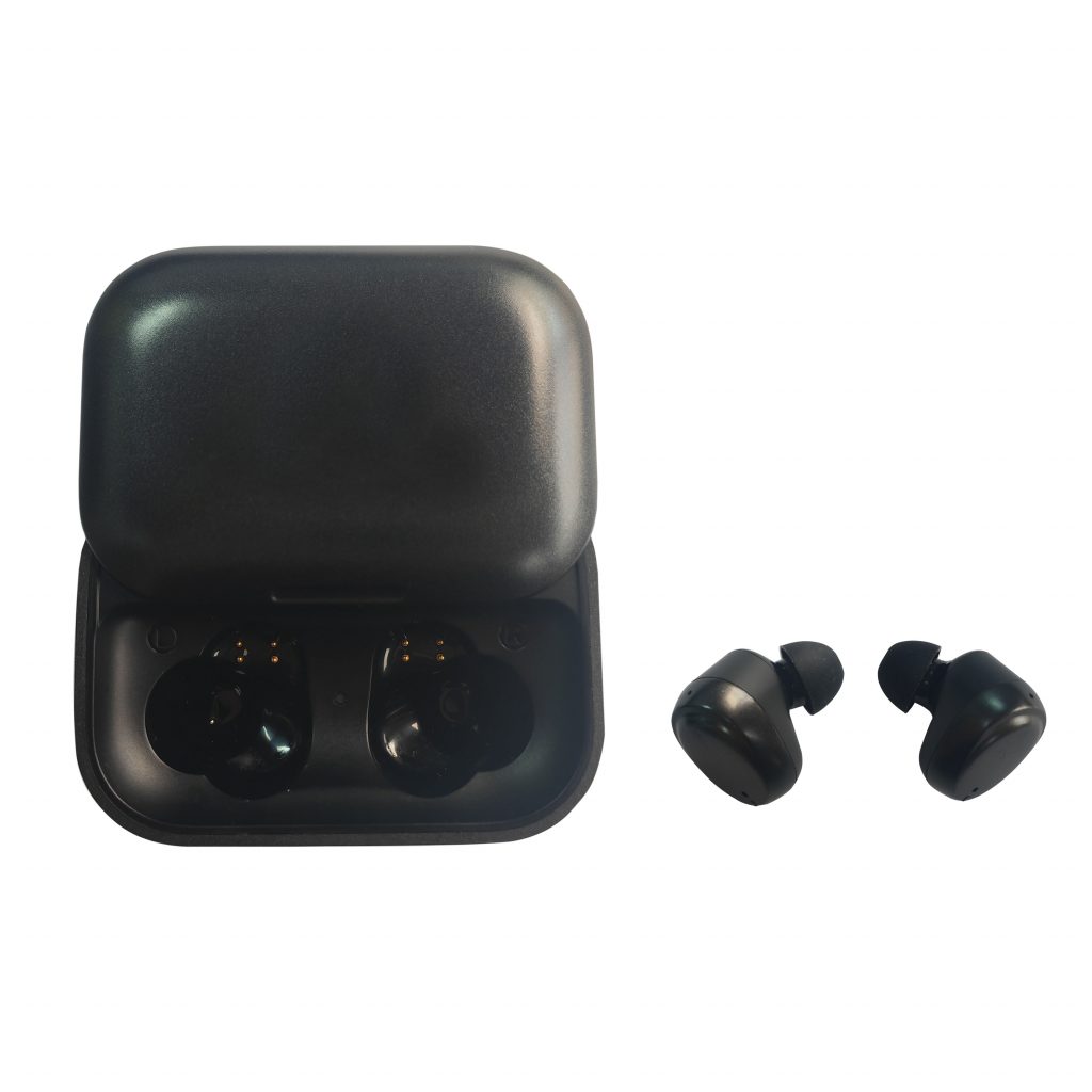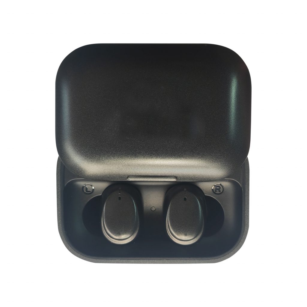 PineBuds – left: buds in carry case // right: buds seen next to the casa