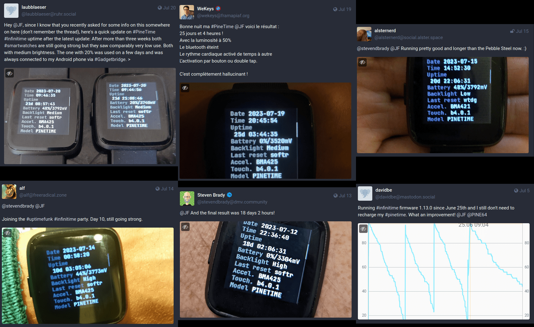 Most of those changes are now integrated in InfiniTime 1.13, and a many users have already reported between 10 days and nearly 20 days of battery life (depending on the features that are enabled: wake up options, BLE, display timeout,…)! My PineTime worked for just over 16 days in my normal use! I’m honestly impressed by those results, and I hope you’ll also notice an nice increase in the battery life of your PineTime!