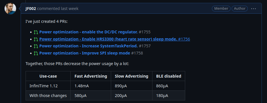 So we tried to apply Ayke’s suggestions in InfiniTime, and the results were also really good: we went from 890µA in sleep mode down to ~200µA with BLE enabled! And a bit less with BLE disabled!