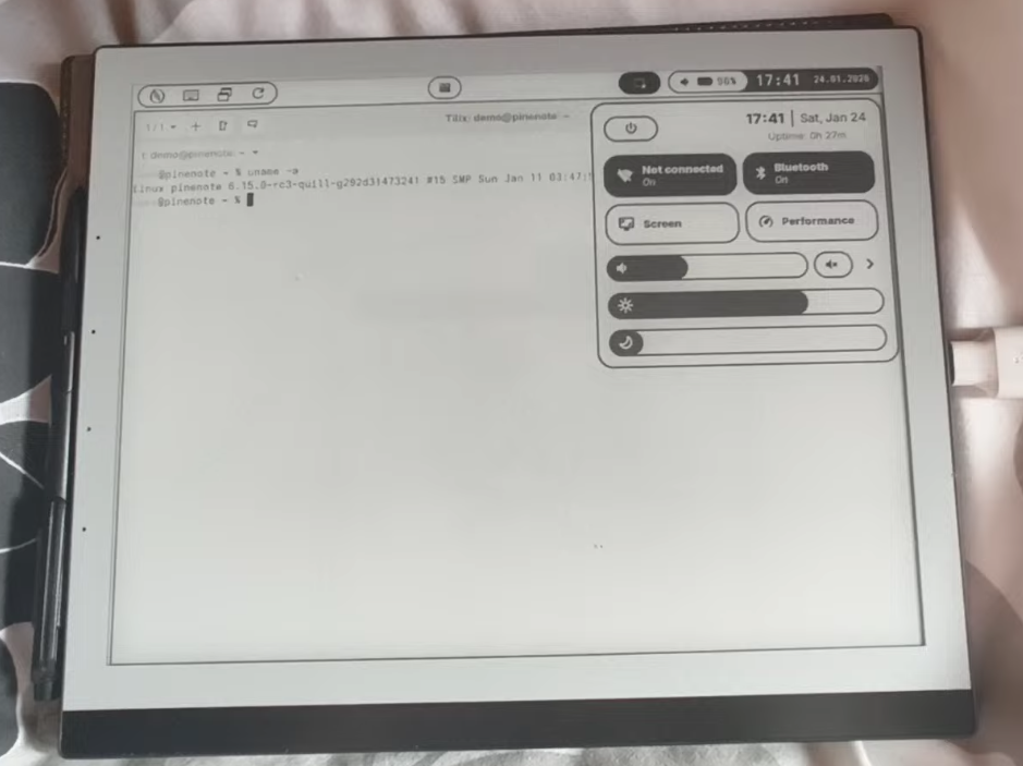 The PineNote was shown off at FOSDEM with a few demos featuring hrdl’s Arch image and a pre-release image of QuillOS using hrdl’s kernel tree. With a massive thanks to Tom.K, Phantomas and hrdl for staying around and helping demo with his PineNote. Some demos included smoothly playing videos, playing doom (you had to be there to believe it!) along with its capabilities as an actual ebook reader.