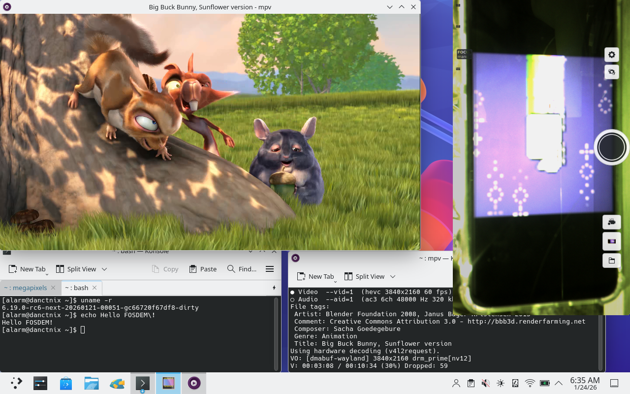 Danct12 put together an image for FOSDEM with camera and support for h264 video decoding. The demo also included a copy of big buck bunny and a razor1911 demo.