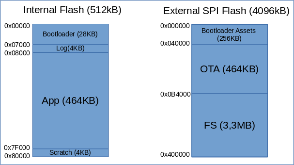 - OTA: SECONDARY SLOT for MCUBoot. During OTA, this is where the new version of the firmware is stored.