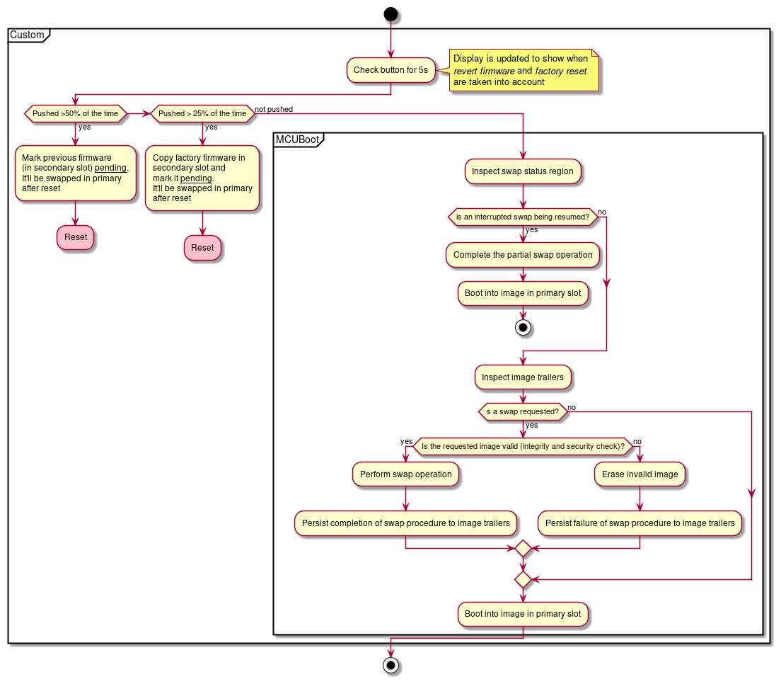 This factory image will be restored either automatically, when the bootloader detect it cannot boot from primary slot (App in internal memory) and secondary slot (OTA from exeternal). The user can also request to restore this factory image if necessary (using the button?).